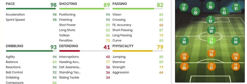 Ilyen statok láttán az ember könnyen kapkodhatja a fejét, na meg a levegőt. 5 csillagos cselezése mellé párosul a szintén erősnek mondható 4-es gyengébbik lába. A tempójában pedig nemes egyszerűséggel két 98-as érték kapott helyet.