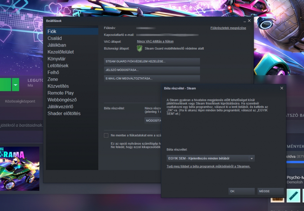 Kattintsunk a Steam beállításokra, majd a Fiókot kiválasztva keressük meg a „Béta” szekciót. Ha jelenleg valamilyen bétában részt veszünk, akkor érdemes kikapcsolni. Ezen kívül érdemes kikapcsolni a Steam Overlay/Átfedést is (Ezt a „Játékban” menüpont alatt találjuk meg a beállításokban), amíg a fejlesztők nem tisztázzák/javítják a probléma forrását hivatalosan is.