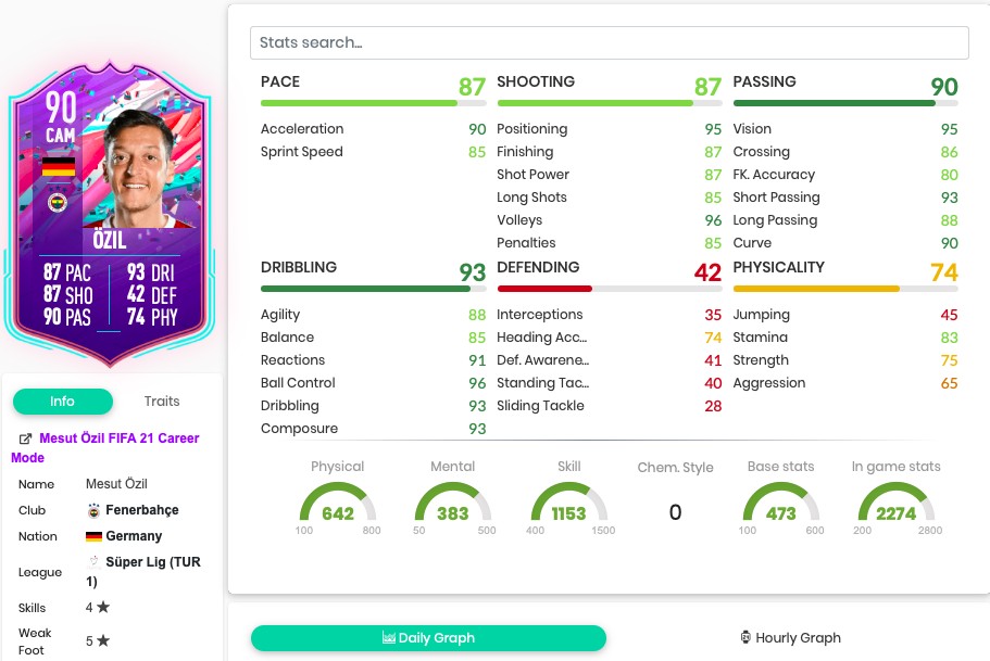 Akárhányszor nézem, mindig remek statokat látok. A tempója talán nem kiemelkedő, de a 90-es gyorsulásával szerintem simán elfutkos középen. A lövése parádés, minden érték 80 pluszos, de közelebb a 90-hez. A levegőből eleresztett lövések, illetve helyezkedés 95, 96-os értékre rúgnak. Passzolása is kimagasló, itt a meglátások pontot emelném ki, ami szintén 95-ös értéket kapott. A labdavezetését ábrázóló hat adatból négy is magasabb, mint 90.