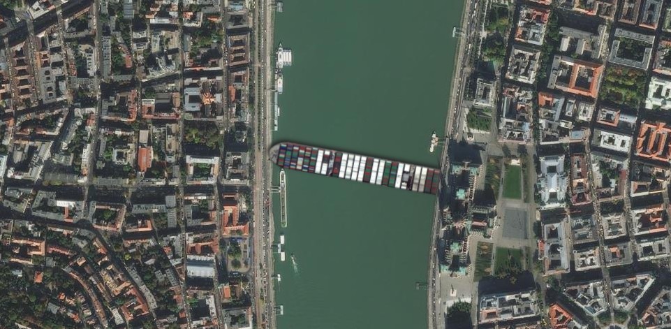 A csapdába szorult, azóta kiszabadult konténerhajó természetesen nem maradhatott ki a repülős játékból sem. Amúgy így nézne ki a Dunán.