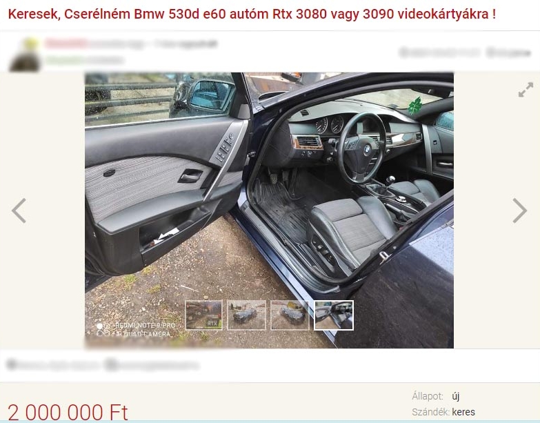 A friss hirdetésben a boldog BMW tulajdonos pénz helyett videokártyát fogad el, természetesen az autó értékében, ami 2 millió forintban van meghatározva. A pontos csere alapja 3 darab RTX 3080 vagy 2db RTX 3090 kártya.