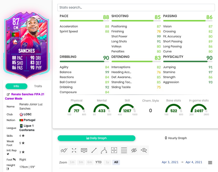 A játék elején hatalmas sláger volt az első IF Renato. Egyáltalán nem volt véletlen az a több százezres ár, amit megkértek érte, pedig mindössze 82-es értékelés vetettek a lapjára. Az IF Sanches-t aztán nagy tesója követte, dinamikusan fejlődő Európa Ligás lapja még feljebb rakta a lécet. Most meg ott tartunk, hogy a két bitang erős meta lapja fejébe kapunk egy még bestiálisabbat. Mondani sem kell, hogy a Gullit gang tagja, mivel minden Base Statja 80+-os. Közel egy árban van a bébi Gullit-al, de annál sokkal jobb lap lehet a szóban forgó. Jelenlegi SBC-je a FUT17-et hivatott megünnepelni, tehát ennek apropóján kapott egy laza 5 csillagos gyengébb lábat. A védekező adataiba vannak gyengébb pontok, valamint 78-as befejezése sem épp a legszebb szám.