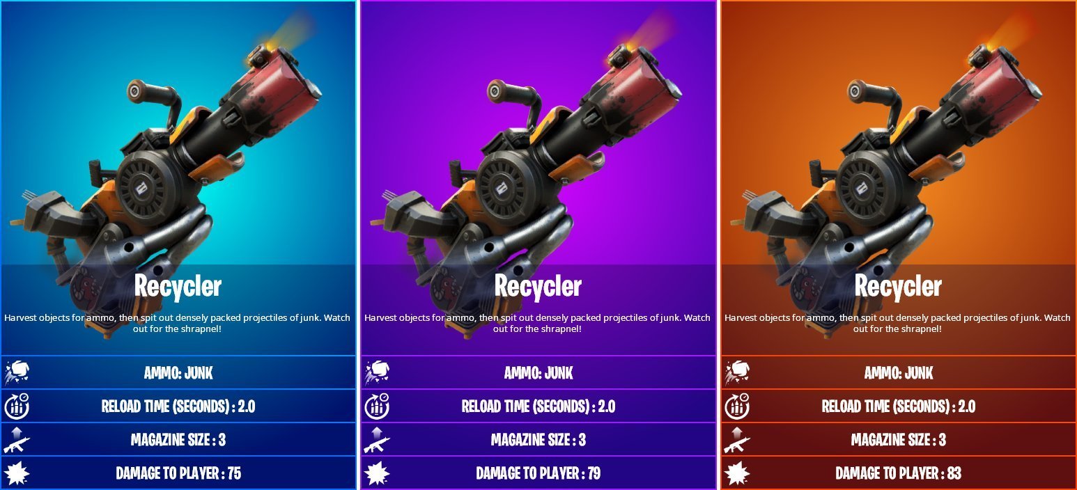 A Fortnite v16.00-os verziójában már említés szintjén megtalálhattuk a Recycler névre hallgató fegyvert. A legutóbbi, v16.10-es update-ben pedig már teljes pompájában ott bújkált a fájlok között. Így nem volt kérdéses, hogy az elkövetkezendő hetekben már viszont is láthatjuk in-game is.
