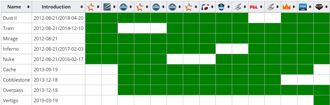 Map pool változások az elmúlt hét év folyamán, előtérben a CS:GO Major eseményeivel.
