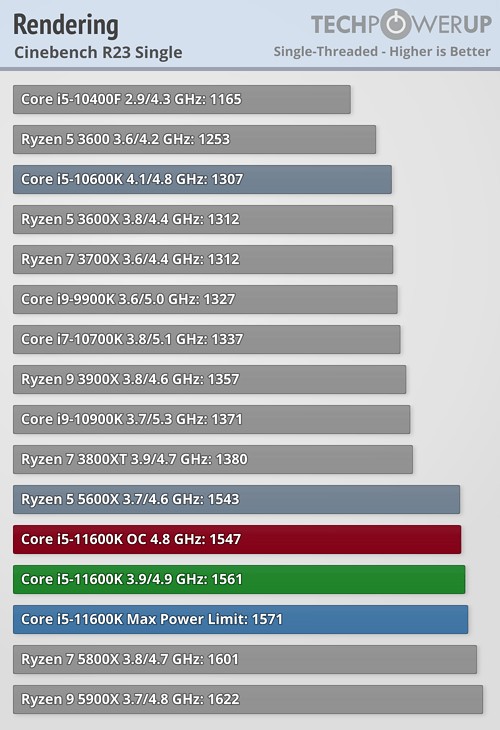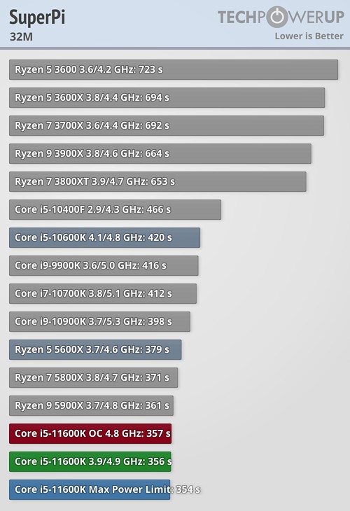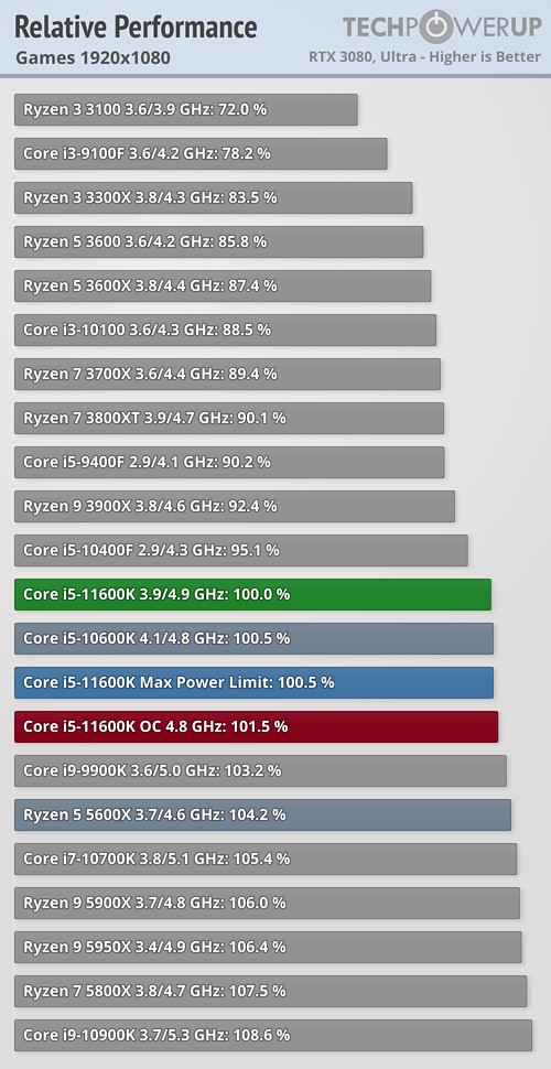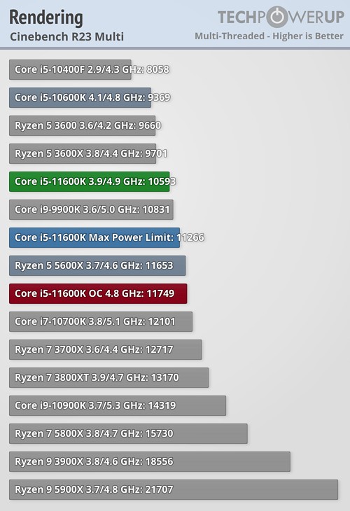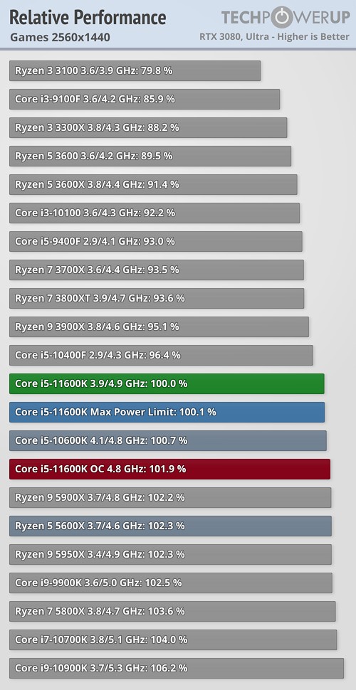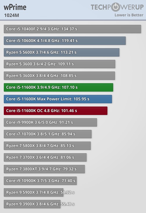 Ahogy a fenti képen is láthatjuk, valahol a 10600K és 9900K között foglal helyett az i5-11600K. A Ryzen 5600X és a korábbi generációs Intel i7-10700K processzorokat már nem tudta legyűrni összesítésben a középkategóriás Rocket Lake.