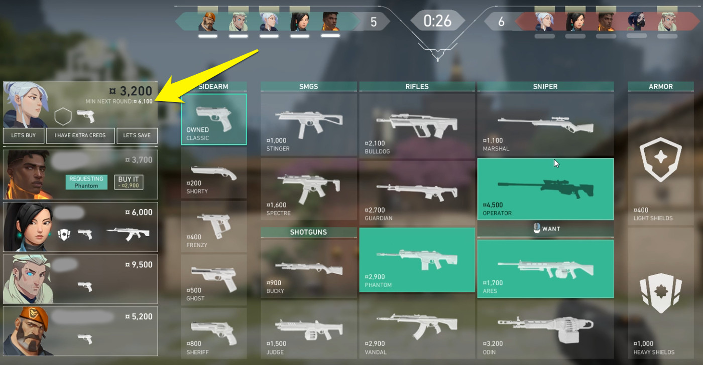 Nem mai kép, de ebből is jól látszik, hogy a VALORANT már a kezdetekkor figyelt arra, hogy segítse az új játékosokat. Az egész menü sokkal átláthatóbb, ráadásul tudsz javaslatokat tenni (vásároljunk, spóroljunk), kérhetsz és adhatsz fegyvert, refundolhatsz, emellett azt is láthatod, hogy mennyi kredittel rendelkezel most és mennyivel fogsz a következő körben.