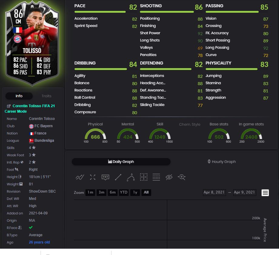 Tolisso egy újabb játékos, aki csatlakozik a Gullit ganghez. A lapon szépen sorakoznak a zöld értékek. A 83-as Stamina talán ami a legtöbb embernek kevés lehet, hisz egy box to box középpályásnál azért bőven kell majd futkorászni középpályán. Nem egy rossz lap, de már rengeteg jobb alternatíva van. Ha coinból akarod megcsinálni, inkább Emre Can FB lapját válaszd.