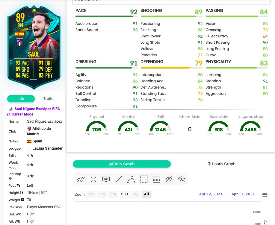 Tegnap este a BL párharcok apropóján felbuzdulva az EA-nek köszönhetően Saul megkapta a neki járó Moments SBC-t. A Statokat szemezgetve azért találunk magas értékeket szép számmal.