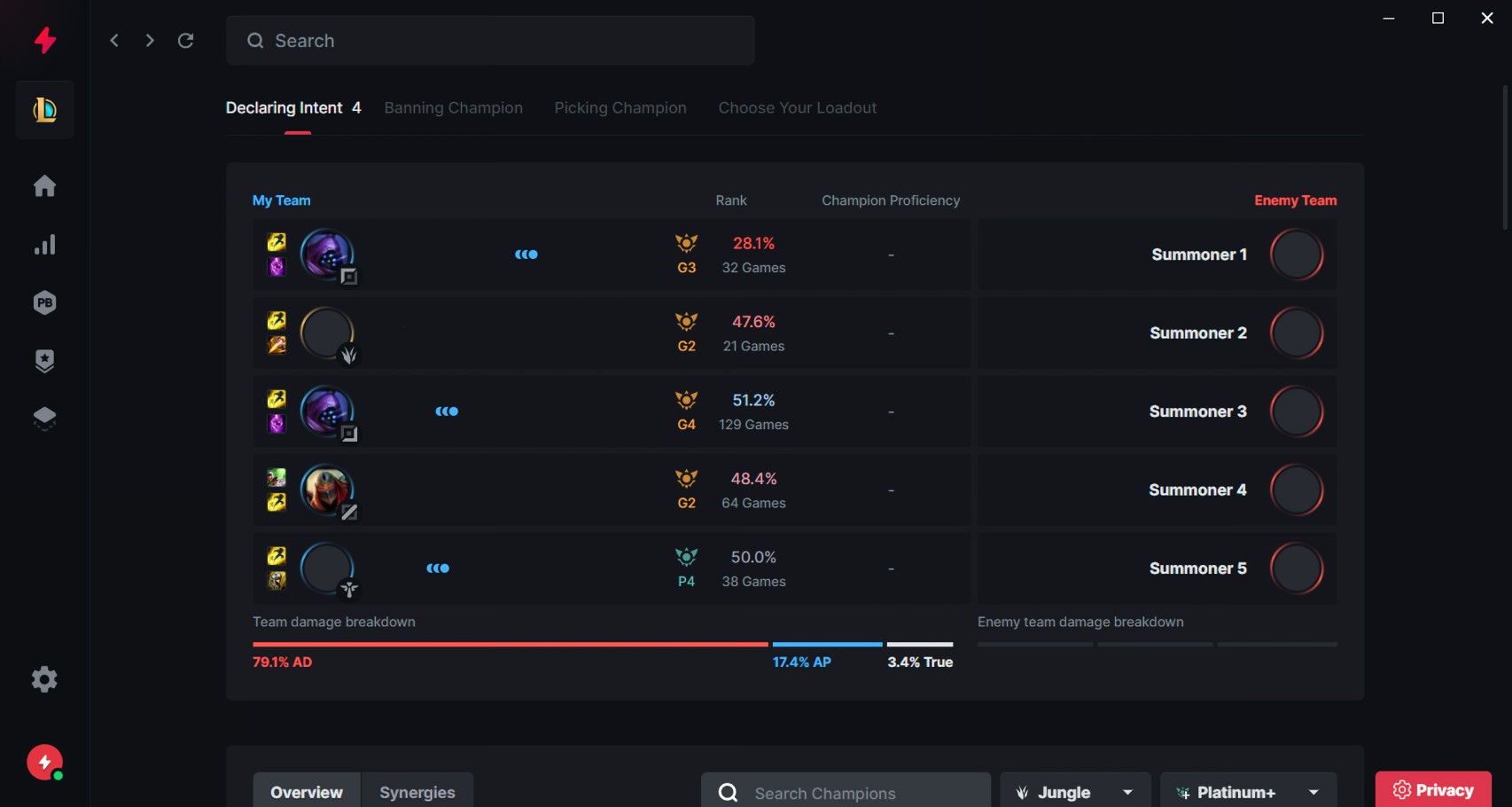 Itt láthatod mindkét csapat winrate-jét: milyen sebzése van a csapatodnak, illetve az ellenséges csapatnak, AD / AP / True damage. Ez felkészít arra, hogy milyen tárgyakat vegyél a hősödre.
