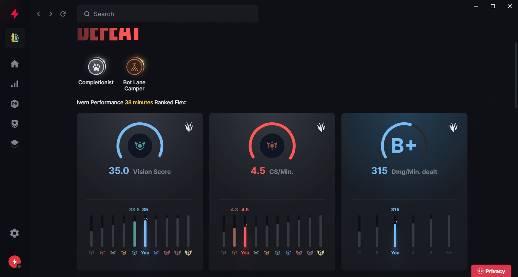 Itt láthatod, hogy mennyire jól wardolsz, last hit arányod és az utolsó a sebzésed a meccs alatt. Ezeket mind a saját szintedhez hasonlítja, hogy tudd, a divíziódon belül hogy teljesítesz.