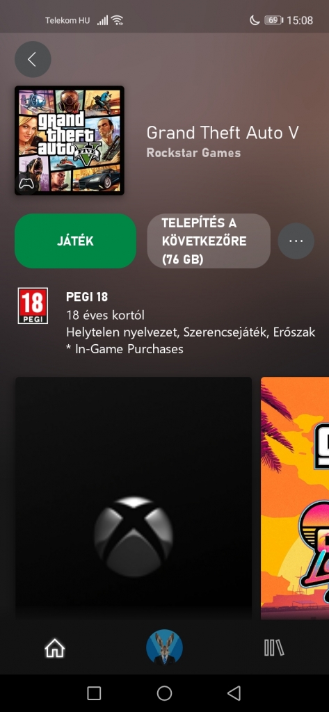 A teszt telefon egy Huawei Nova 5T (Honor 20) egy Xbox One S kontroller társaságában és minden követelménynek megfelelő hálózati körülménnyel. A gépen beregisztrált fiókkal probléma nélkül sikerült bejelentkezni az Androidos alkalmazásban és máris felbukkant a játékoknál a „Cloud” opció. Mi mással is próbálhatnánk ki, mint a Rockstar Games 2013-ban megjelent játékával, a GTA V-tel.