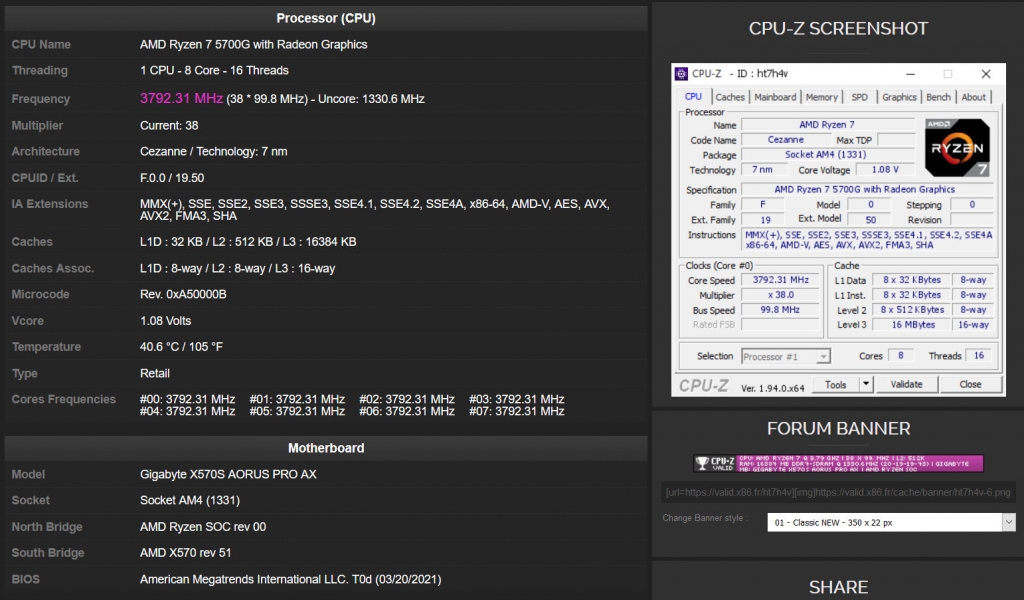 Itt láthatjuk, hogy a tesztet az AMD újonnan bejelentett Ryzen 7 5700G processzorával végezték. Az 5000-es sorozatú APU-k egyelőre csak az OEM-gyártókra korlátozódnak, így sejthető, hogy maga a GIGABYTE maga kezdte szivárogtatást a CPU-Z validáció nyilvános bejegyzésének felhasználásával.
