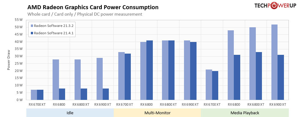 Méréseik alapján, az előző 21.3.2-es driverhez viszonyítva a Radeon RX 6000 széria kártyái, az RX 6700 XT, RX 6800, RX 6800 XT, és RX 6900 XT fogyasztása jelentős mértékben csökkent olyan felhasználási területeken mint médialejátszás vagy egyszerű „idle” állapot.