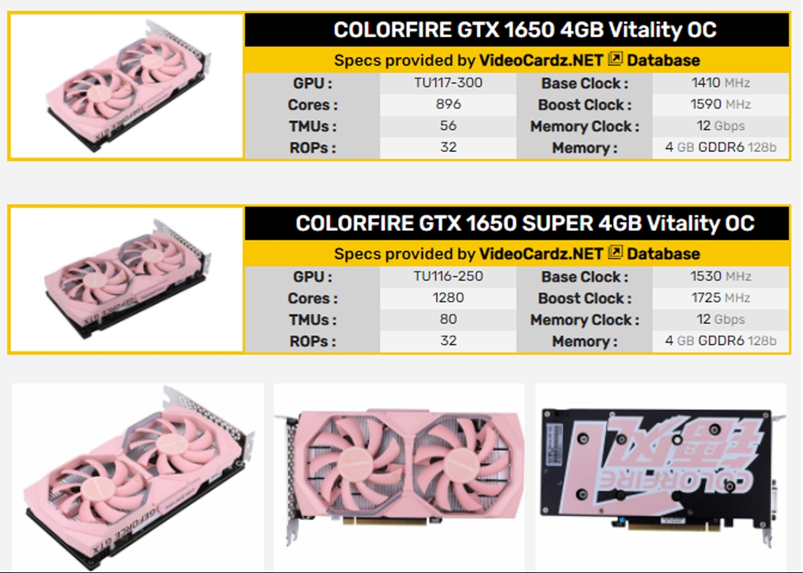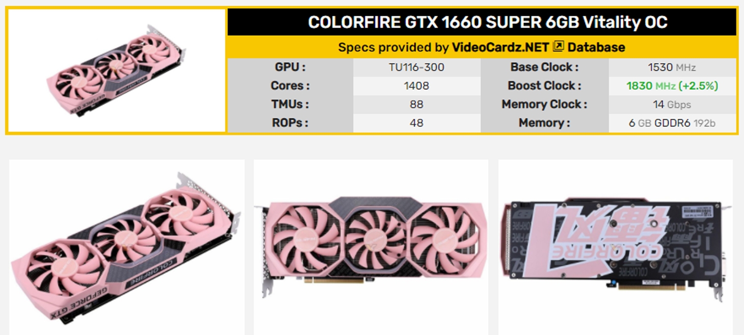 A hamvaiból feltámadott márka három új rózsaszínű kártyát mutatott be: a GTX 1660 SUPER-t, a GTX 1650 SUPER-t és a GTX 1650 GDDR6-ot. A TU116 alapú modell három ventilátorral, míg a TU117 GTX kártyák kettővel vannak felszerelve, külön érdekesség, hogy mindegyiket Vitality OC-nek hívják, de csak az egyik kártya van gyárilag túlhajtva.