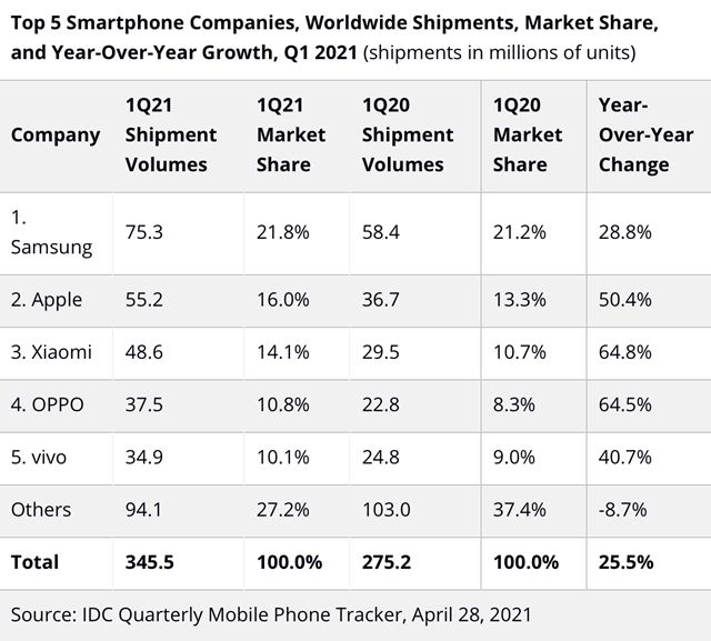 Első körben talán érdemes megnézni a globális helyzetet. Az alábbi képen azt láthatjuk, hogy a globális eladásokat, piaci részesedést és az évről évre tartó növekedést figyelembe véve melyik az az 5 okostelefongyártó, mely a legkedveltebb a világon. Az IDC listája szerint az első a Samsung, a második az Apple iPhone és a harmadik a Xiaomi.