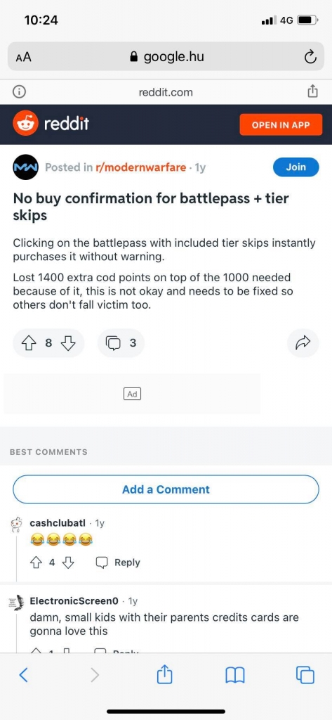 Van még egy csavar a történetben: több felhasználó jelezte hazai közösségi felületeken is, hogy nála bizony van confirmation képernyő. Ezzel szemben a reddit threadek alatt bizony a legtöbb játékos ennek ellenkezőjéről panaszkodott, illetve régebbi bejegyzéseket is találtunk a COD szériával és a bizonyos megerősítés hiányával kapcsolatosan. Az is előfordulhat, hogy más jogszabályok vonatkoznak az USA és EU játékosaira, de az sem elképzelhetetlen, hogy platformfüggő a dolog. Néhányan azt is feltételezik, hogy az ingyenes Tier Skip lett elhasználva a figyelmetlen játékosok által, de akkor nem kerülne levonásra CP pont, így ez nagy eséllyel kiesik.