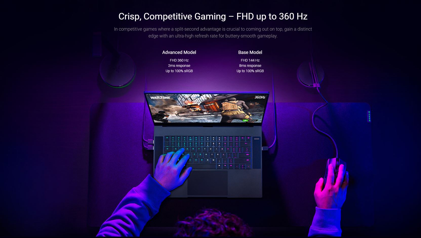 A Razer Blade 15 Advanced Model laptopok – a nagy sebesség jelentette előnyökre vágyó játékosok számára – FHD 360 Hz-es kijelzőkkel, valamint – azon tartalomalkotókra gondolva, akik szabadidejükben játszani is szeretnek – 240 Hz-es, a DCI-P3 színtartomány 100%-át lefedő QHD kijelző-változatokban érhetőek el. A 4K OLED változat pedig most első ízben fogja igába hajtani az Intel® Core™ i9 processzor erejét.