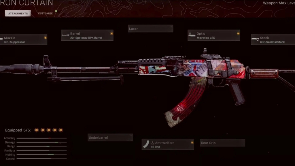 A loadoutban helyet kapó kiegészítők megerősítik a fegyver sebzését és mobilitását is, mindeközben pedig távolabbra is eredményesebbek leszünk. A Gru Suppressor által megnövelt lövedéksebesség és hatékony sebzési távolság miatt kiváló barátunk lehet a közepes távolságú harcoknál. A 20″ Spetsnaz RPK Barrel pedig csak tovább növeli ezt. A KGB Skeletal Stock kötelező kiegészítő azoknak, akik imádnak agresszívan rárontani az ellenfelekre, többek között növeli az ADS lövés közbeni mozgási sebességünket, illetve még a sprintelés / lövés állapotok közötti időt is leszűkíti.