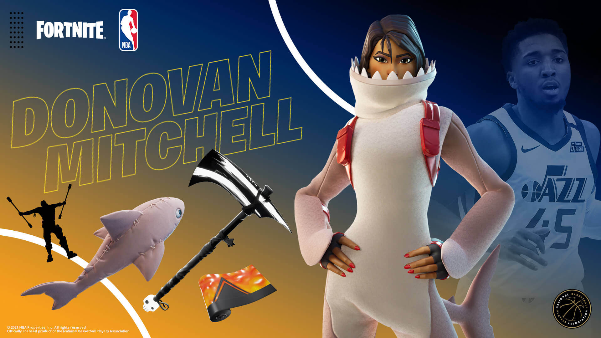 A Fortnite és az NBA közös crossover esemény számtalan kosaras tematikájú elemet hozott a játékba. Ezek közül az egyik a Donovan Mitchell Locker Bundle, melynek tartalmait most megnézheted alább. Donovan Mitchell Jr. (született 1996. szeptember 7.) amerikai profi kosárlabdázó a Nemzeti Kosárlabda Szövetség (NBA) Utah Jazz csapatában. Újoncként Mitchell bekerült az NBA All-Rookie First Team csapatába, és megnyerte a 2018-as Slam Dunk versenyt.