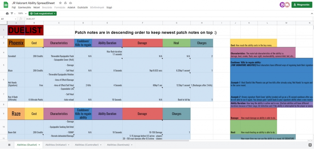 Ezeket nem is olyan egyszerű nyomon követni, főleg ha az ember nem a kezdetektől fogva játszik a Valoranttal. Aggodalomra semmi ok, pár lelkes játékos egy igazán átfogó táblázatot készített a ügynökökről és azok képességeiről.