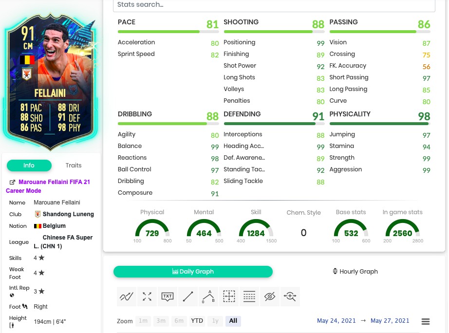 Lássuk milyen In-Game statokkal látták el Kanadában ezt a Fellaini SBC lapot: