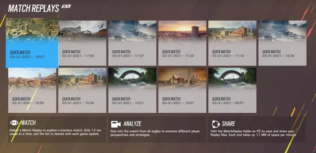 A Watch in-game fülön megtalálod az elmúlt meccseid visszajátszását. Jelenleg ebből 12 darabot tárol el LOKÁLISAN a játék, így az izgalmas pillanatok lementésével vagy az adott mérkőzés kielemzésével nem érdemes sokat várnod. Papíron csak a saját visszajátszásaidat nézheted meg, de a későbbiekben könnyedén visszanézhetsz akár majd profi meccseket is.