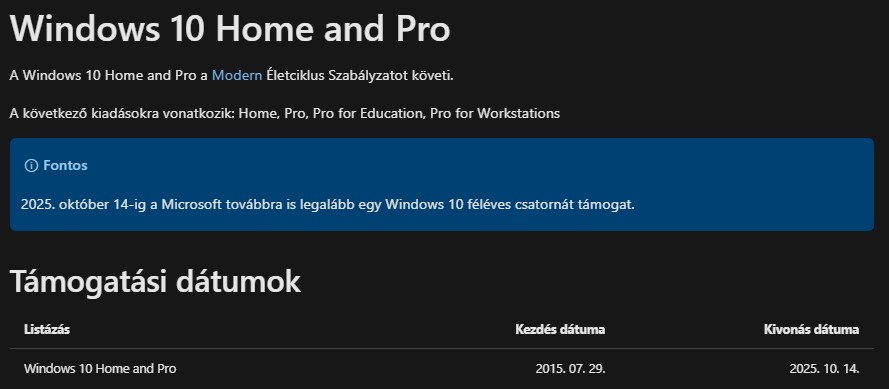 Viszont erről árulkodhatott most a Microsoft hivatalos oldala, melyen a rendszerei élettartamának dátumait rendszerezi. Itt újonnan azt láthatjuk, hogy a Windows 10 Home és a Pro verziók profilján már feltüntették a tervezett kivonás dátumát.