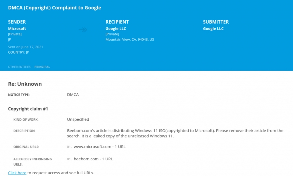 Egy DMCA kérelmet nyújtottak be a Google-höz, melyben elhangzik a Windows 11 név is!