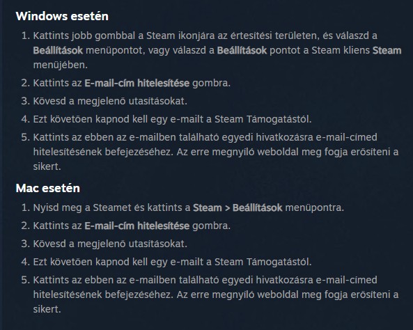 • Ha valamiért nem lenne hitelesítve az e-mailed, akkor ebben a procedúrában kiváló segítséget nyújt a Steam magyar nyelvű felülete: