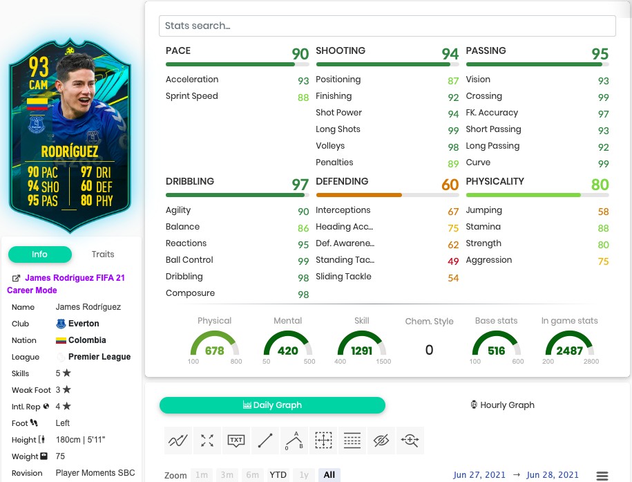 • Gyorsulás(93), Reakció(95), Labdatartás(99), Labdavezetés(98), Higgadtság(98), Befejezés(92), Lövőerő(94), Távoli lövések(99), Kapás lövések(98), Meglátások(93), Beadás(99), Csavarás(99),