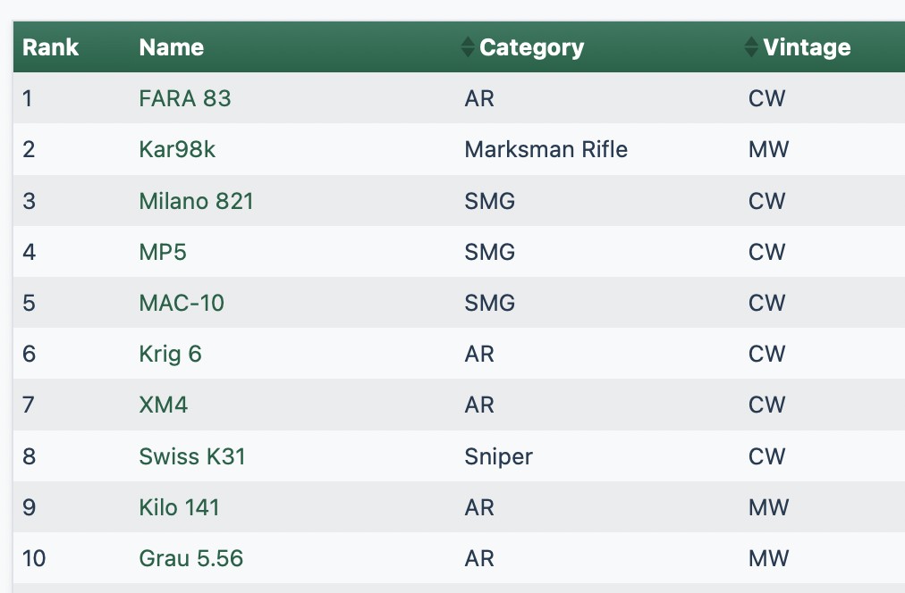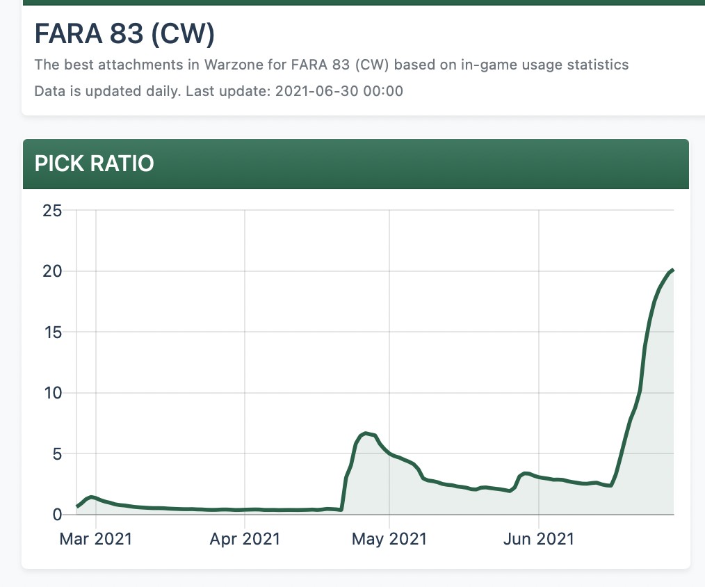 A FARA 83 irgalmatlan menetelést mutatott be, akárcsak a Milano. Bár nem az 57. helyről kellett feltornáznia magát, sosem volt még a TOP 5 listánkban március óta. Szinte nulla visszarúgásának köszönhetően rengeteg játékos választotta az elmúlt hetekben, sosem volt még ilyen népszerű a fegyver.