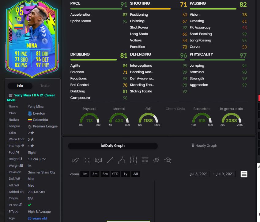 Magas, erős, gyors. Mindennel meg van áldva, amire egy jó belső védőnek szüksége van. Mina az angol csapatokba biztosan befér, de mivel sokan csinálták meg Ramost a legtöbben mellette Éder Militaot használnak. Tudom július van, de szerintem statok alapján egy igen remek lappal gazdagodunk. Ha pedig már nem használnák valamelyik SBC-be jó lesz.