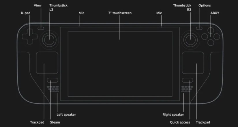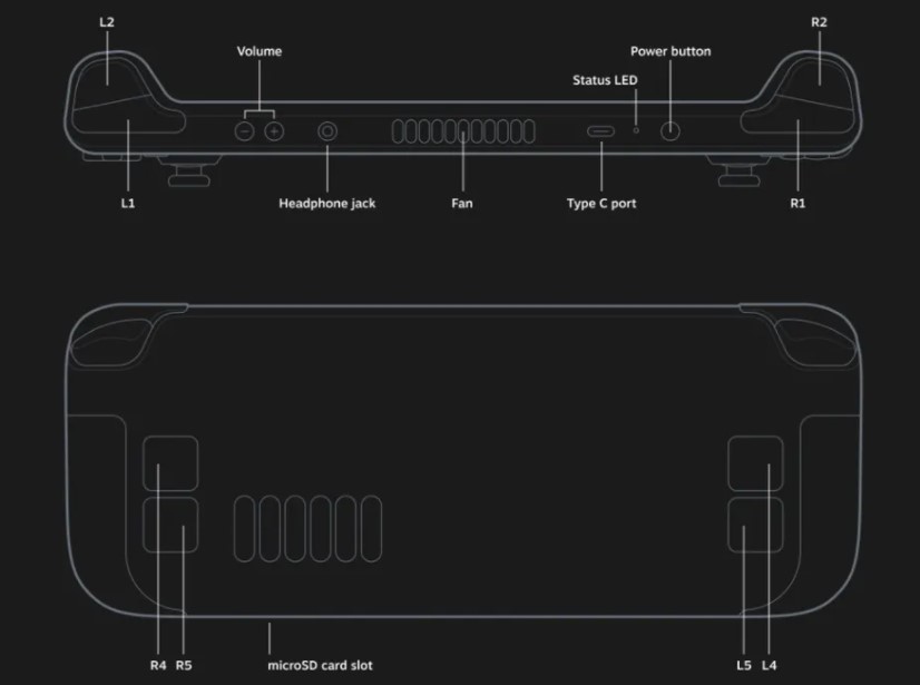 Mint a fenti képen is látható, a Steam Deck kézikonzolhoz mérten egészen kiváló irányítási lehetőségekkel van felvértezve. A kötelező jellegű dupla analóg, D-pad, ABXY, és a hátsó négy gombon-ravaszon túl találunk rajta dupla trackpadot, érintőképernyőt,egy dedikált Steam és Gyors elérés gombot, és négy hátsó plusz billentyűt – R4-5 és L4-5. De akad még rajta fizikai hangerőszabályzó, dupla mikrofon és nyilván hangszóró, egy USB-C a töltésért, és egy Jack-csatlakozó is.