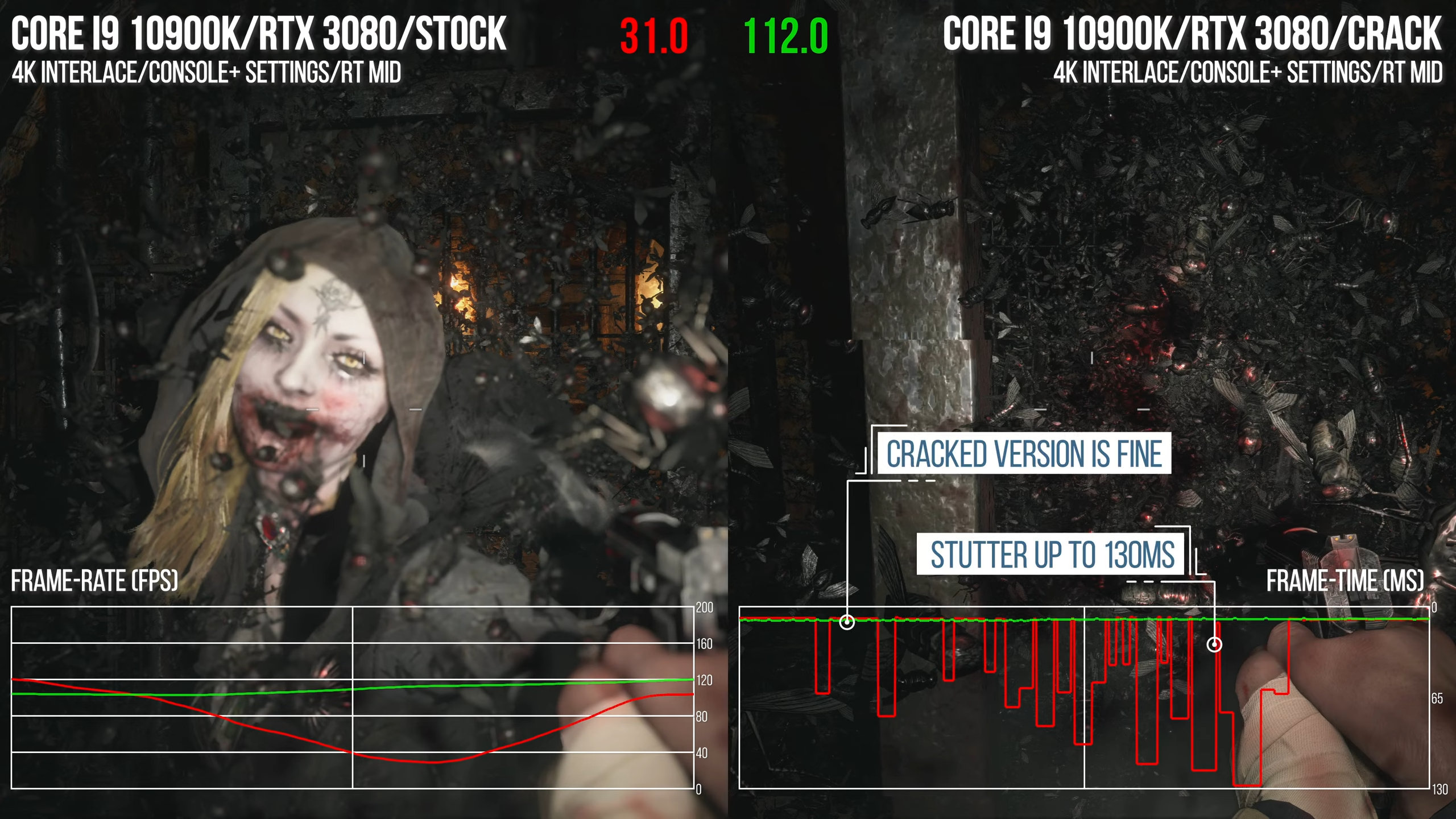 A Digital Foundry alapos munkával összevetette az eredeti játékot és a pár napja napvilágra került „DRM mentes” tört játékot is. Meglepődve tapasztalták, hogy a crackelt verzióban egyszerűen nincs nyoma ezeknek az akadásoknak, tökéletes frametime-okat mértek. A fenti képen a zöld, egyenes vonal a crackelt játéké, míg a piros, össze-vissza ugráló vonal a virtuális áruházakban megvehető, eredeti példányé.