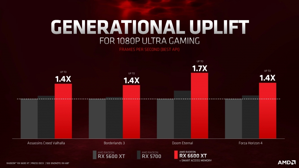 A teljesítmény a legutóbbi generációs RX 5600 XT-vel lett összehasonlítva. Az AMD szerint az új RX 6600 XT 1,4x-1,7x gyorsabb az RDNA1 modellnél.