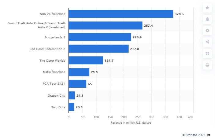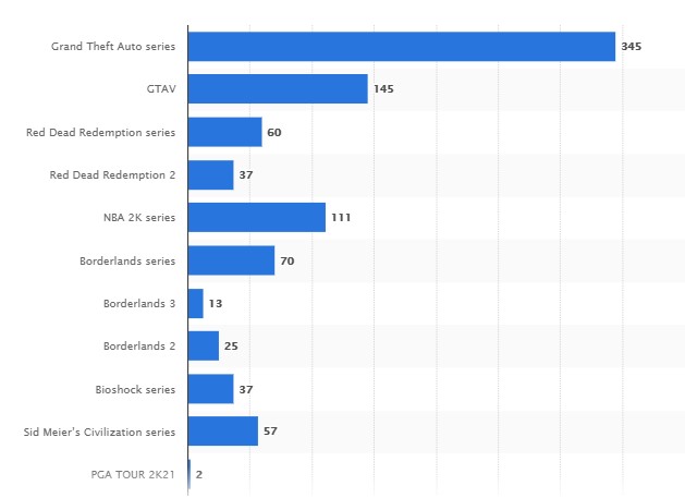 No, de talán nem is ez a legérdekesebb része a T2 történetének. A Statista legfrissebb statisztikái szerint, a kiadó legeslegnépszerűbb játéksorozata a Grand Theft Auto, amely a története óta 345 millió példányban talált boldog gazdára.
