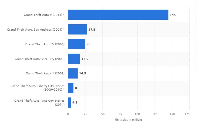 Mindebből csak a GTA V 145 millió darabot vállal magára, amivel messze magasan a franchise legtöbbet játszott etapja, 8 évvel a megjelenése után, mind a mai napig.