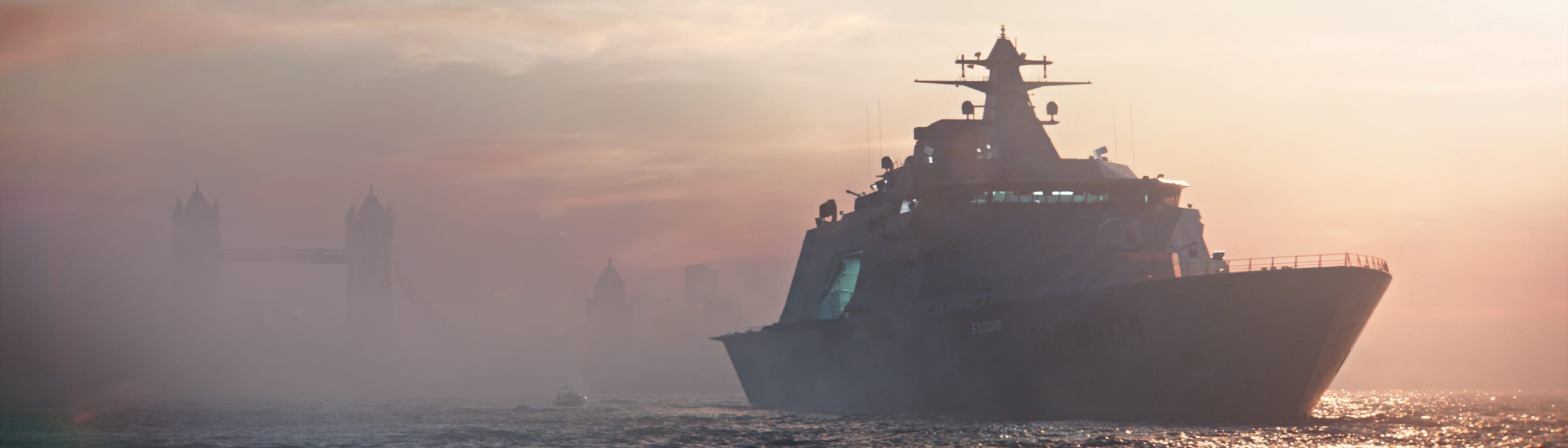 A képen egy ködbe burkolózott hajó látható, a horizonton pedig tisztán kivehető a Tower Bridge és a Big Ben