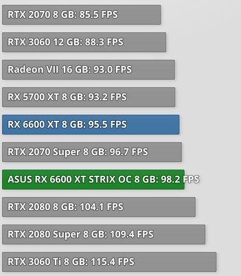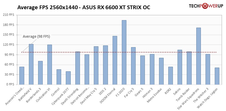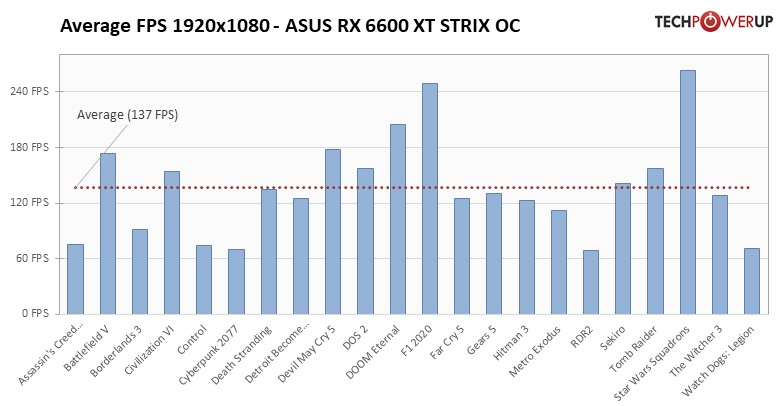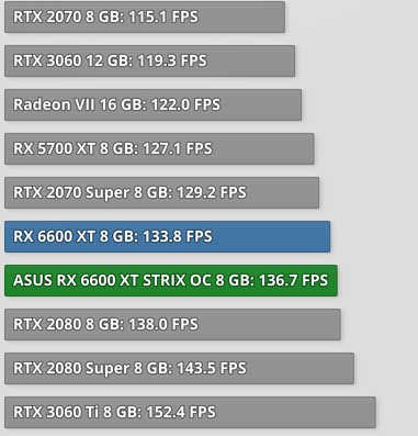 A kártyát az AMD az alsóbb kategóriába pozícionálta, ennek megfelelően a Navi 23 GPU-t kapta meg 8 gigabájtnyi GDDR6 memória társaságában, az alapórajel pedig 2.4 GHz környékén alakul. Két fontos értéket kell néznünk, az FPS számokat és a fogyasztás, illetve ezek összehasonlítását más kártyákéval. A grafikonokat a TechPowerUP Asus RX 6600 XT STRIX tesztjéből emeltük ki.