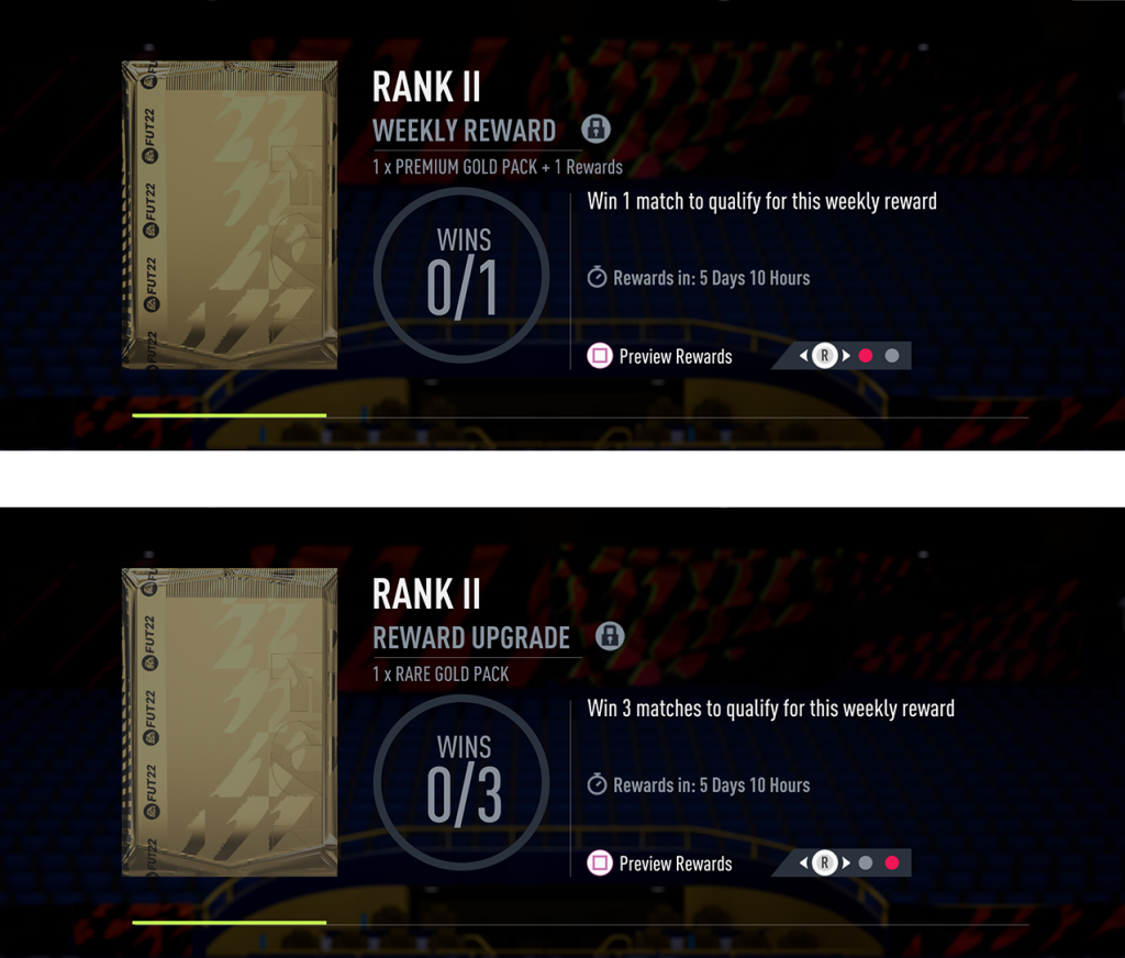 A Weekly rewardok megmaradnak, amiket a héten lejátszott meccsekért kapunk. Ha sikerül még hét befejezése előtt elérni a nagyobb Diviziót úgy már arra a hétre is a jobb rewardokat kapjuk.