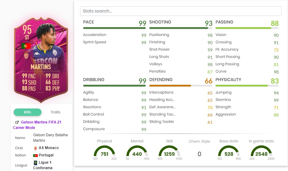 Az év eleji metába, Mbappé, Neymar és Renato Sanches mellé tökéletesen beillik a monacói. 5 csillagos trükkmozdulatainak köszönhetően könnyen helyben hagyjuk az ellenfelet, és megfizethető áron jutunk egy jó játékoshoz, ha a nagyokra még nem futja. A FUTTIES lapján továbbra is 5 csillagos trükk és 4 csillagos gyengébbik láb szerepel H/H. Average body type mellé Outside Foot Shoot, Flair, Speed és Technical dribbler traitet kapott. Maxos pace mellé, mutatós lövés és dribbling statokat kapott. Aggressziója magas, és a Composure is 99-es. Elképesztő lap és egy kicsit felkészülhetünk a FIFA 22-re, azzal, hogy ez a kártya visszatér a csapatunkba.