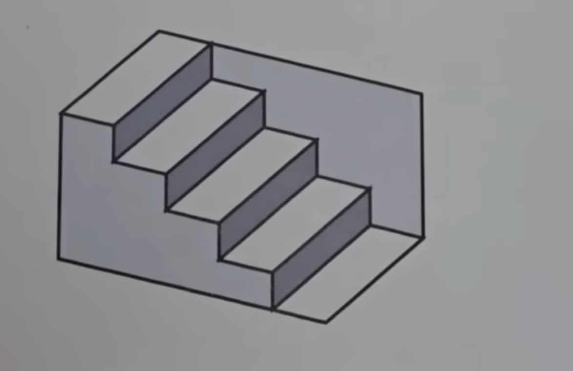 A szóban forgó 3D-s tárgynak szintén két értelmezése van, mindkettő felülről nézve lépcső, és az értelmezések egyikről a másikra váltanak, ha a tárgyat 180 fokkal elforgatjuk a függőleges tengely körül.