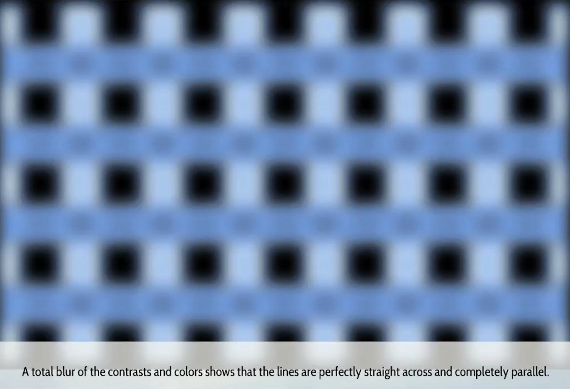 Ha ránézünk, a sötétkék sorok ferdének tűnnek, igaz? Pedig az igazság az, hogy valójában teljesen egyenesek és párhuzamos sorokban láthatók a képen. A sorok a fény és a szín kontrasztjai és változatai, valamint a gyémánt „célpontok” különböző szögei miatt tűnnek ferdének a kereszteződéseknél. Ha a képen látható fekete-fehér részre fókuszálunk, láthatjuk, hogy a vonalak egyenesen állnak.