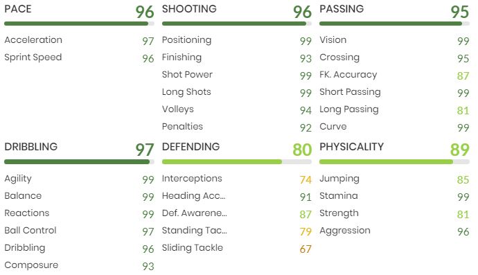 A laphoz mindösszesen 2 db SBC-t kell teljesítenünk, mindössze 100 050 és 122 700 Coin közötti költséggel számolva. Képességeit és statisztikáit elnézve pedig ár-érték arányban jelenleg az egyik legjobb lehetőség, jól működő középpályásként beépíteni a csapatunkba, hiszen a passzolásán kívül minden – a ratinget befolyásoló – értékét nézve, magasabban áll, mint pl. egy 96-os TOTS, vagy egy 96-os TOTY Kevin De Bruyne. Remekül fordul, jó a balance, jól helyezkedik, erős és pontos lövésekkel képes bombázni az ellenfél hálóját; tehát minden feltétele adott ahhoz, hogy rászolgáljon a bele fektetett Coin-ra és bizalomra. Pozíció szempontjából CDM felett bárhol bevethető, hiszen mindenhol 90 feletti értéket hoz.