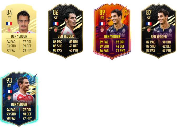 Ben Yedder tavaly hatalmasat ment a FIFA 20 alatt, hiszen 12 (!) féle lapot kapott az EA-től, a Ones to Watch-tól egészen a TOTS-ig mindenféle kártya terítéken volt, ha a Monaco csatáráról volt szó. Idén nem tudni, mi volt az EA-vel, hiszen több helyről lehetett hallani, hogy ha valaki az ellenfél csapatában Ben Yedder-t lát, majd a meccsen megkapja tőle az 1. gólt, érdemes kilépni, hiszen hamarosan több is követi. Ehhez képest 5-re redukálódott a tavalyi 12. Igaz, hogy itt is volt TOTW, HEADLINERS, valamint TOTS, de akkor is furcsa.