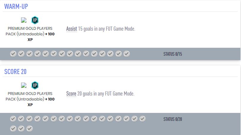 A 7 küldetésből álló sorozatért összesen kapható 7 x 100 XP, 5 db Premium Gold Players Pack és 2 db Mega Pack, a végső jutalom pedig nem más, mint 500 XP, valamint egy Jumbo Rare Players Pack.