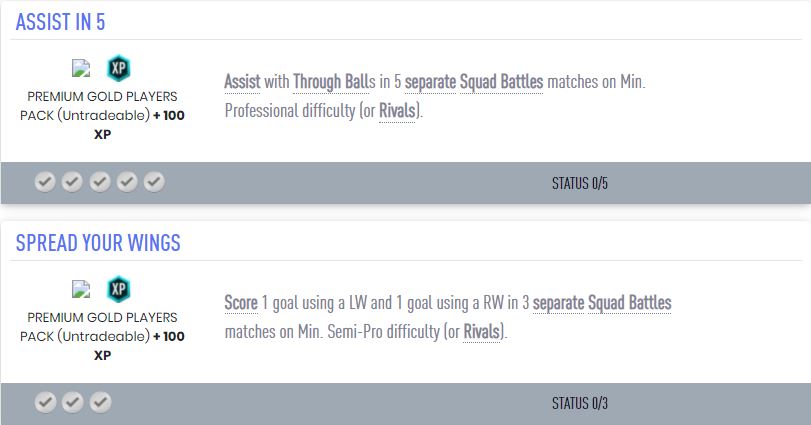 Ezeknél a feladatoknál szükségünk van 5 olyan meccsre, amikben olyan gólokat lövünk, amit egy szöktetéses assist előz meg, valamint 3 olyan mérkőzésre, amikben 1-1 gólt egy LW és egy RW poszton játszó játékos szerez.