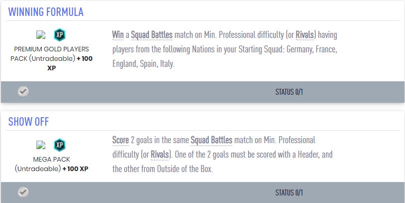 Itt az egyik feladatnál a következő kritériumnak kell megfelelni: úgy kell megnyerni a mérkőzést, hogy a kezdőcsapatunkban a következő nemzetekből kell szerepelnie 1-1 játékosnak: Németország, Franciaország, Anglia, Spanyolország és Olaszország. A másik küldetésnél 2 gólt kell szerezni egy meccsen belül, a 2 gól egyike fejes kell legyen, a másik pedig a 16-oson kívülről kell szülessen.