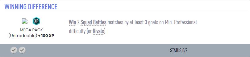 Az utolsó feladatunk pedig az, hogy 2 meccset kell nyernünk, minimum 3 góllal. A küldetéseket Squad Battles, vagy Division Rivals módban tudjuk teljesíteni, Squad Battles esetén 1 feladatot kivéve (Spread Your Wings) a meccseken minimum Professional szinten kell játszanunk; az 1 kivétel minimum Semi-Pro szinten is teljesíthető.