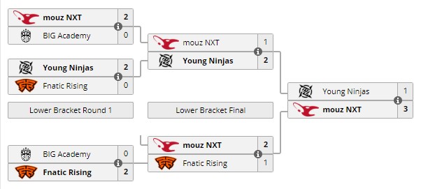 Azt nem mondhatjuk, hogy teljesen egyenes út vezetett a döntőhöz, hiszen a Young Ninjas csapata az elődöntőben alsó ágra küldte a mouz NXT gárdáját. Ám ez sem állíthatta meg őket, a Fnatic Risingon átverekedve és újult előre kapva végül 3-1-re legyőzték a Young Ninjas ötösét, így övüké lett a 45000 dolláros (13 millió forintos) főnyeremény.